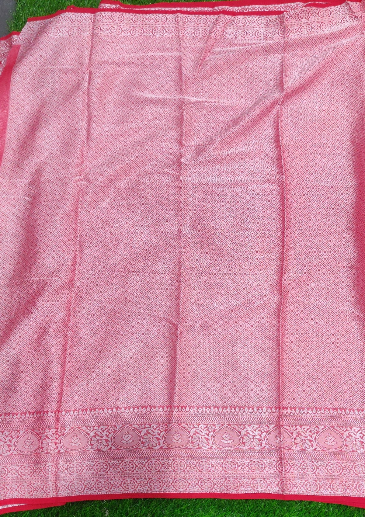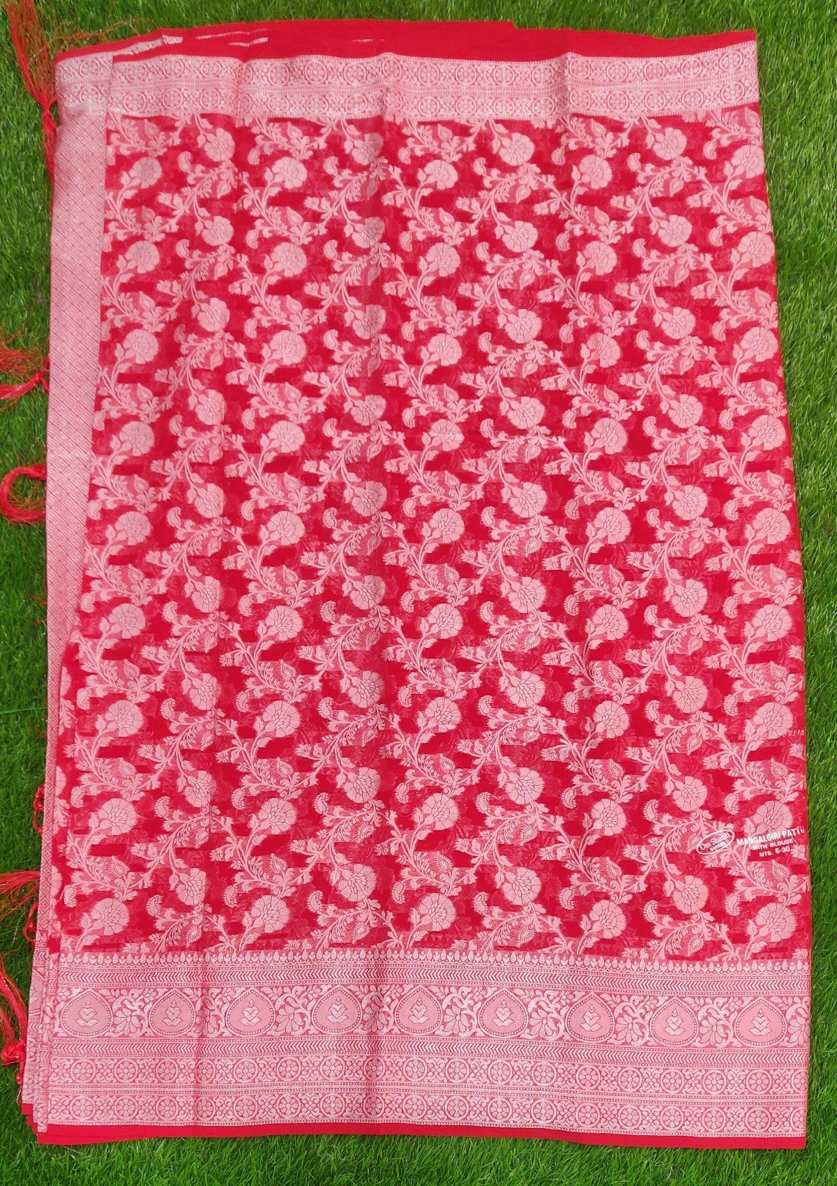 The saree is predominantly red with intricate silver zari work, featuring floral and geometric patterns. The border is richly decorated with traditional motifs, enhancing its elegance and opulence.