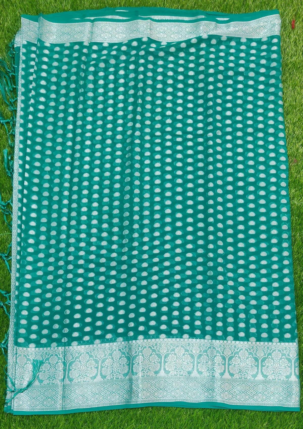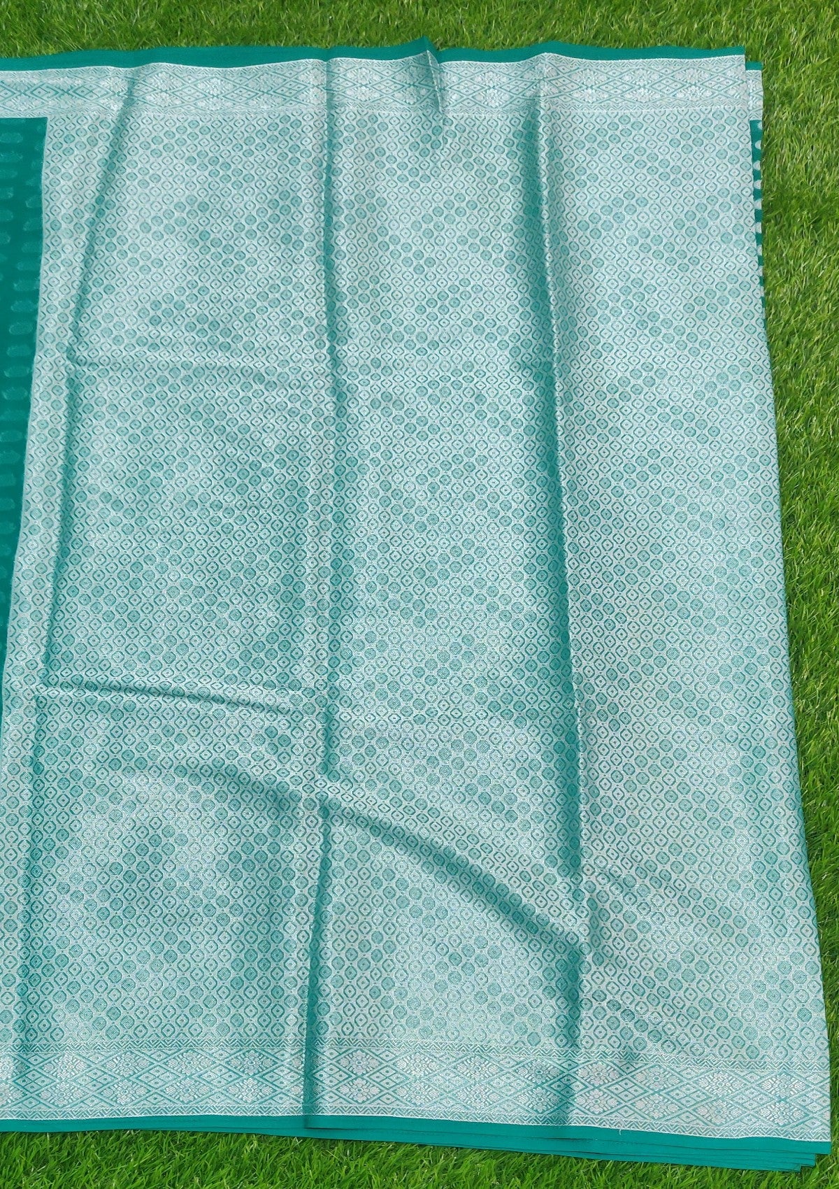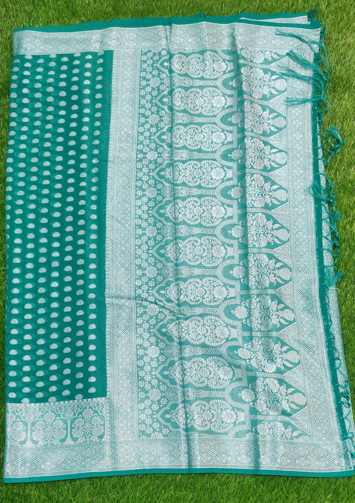 The saree is predominantly ramagreen with intricate silver zari work, featuring floral and geometric patterns. The border is richly decorated with traditional motifs, enhancing its elegance and opulence.