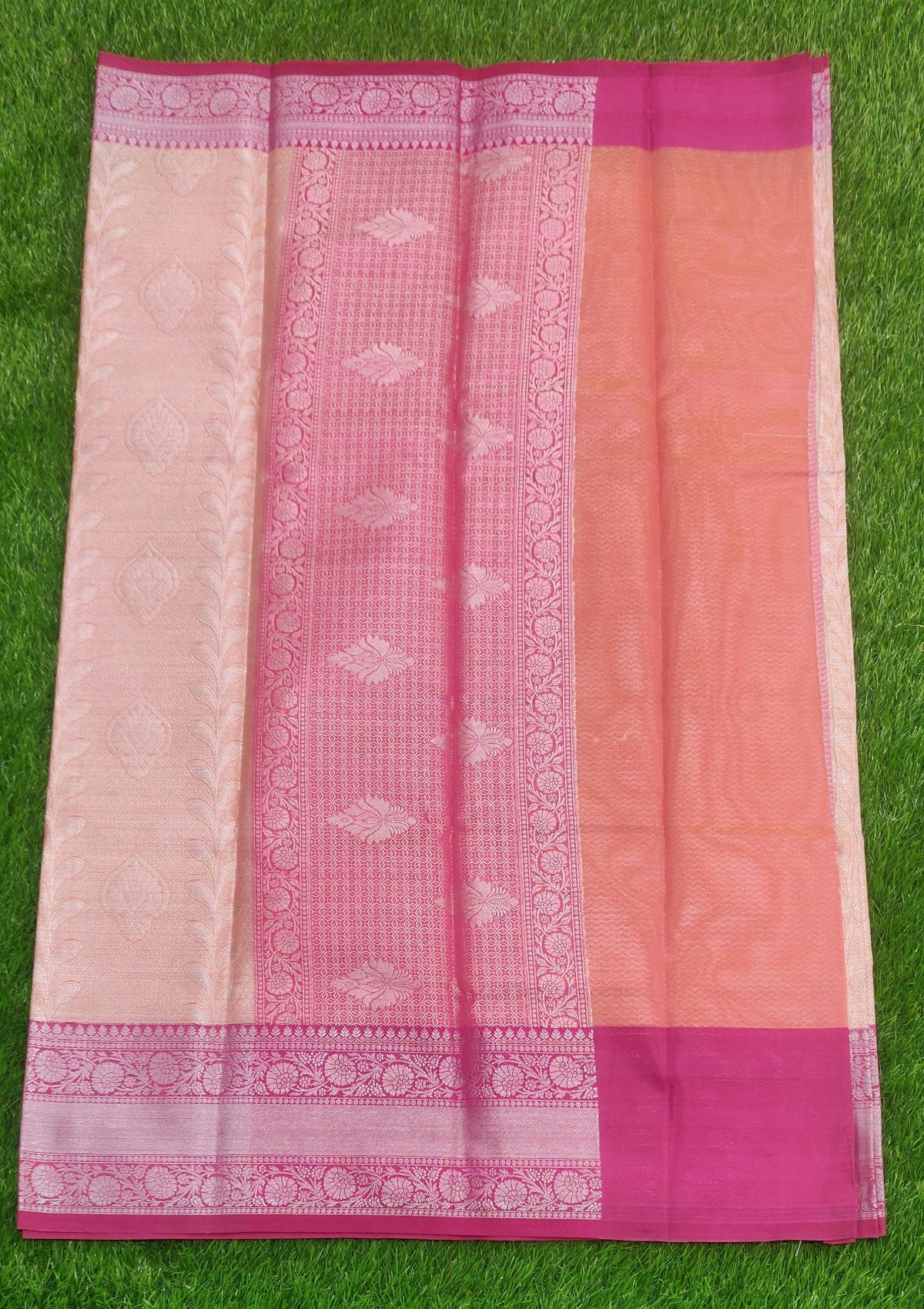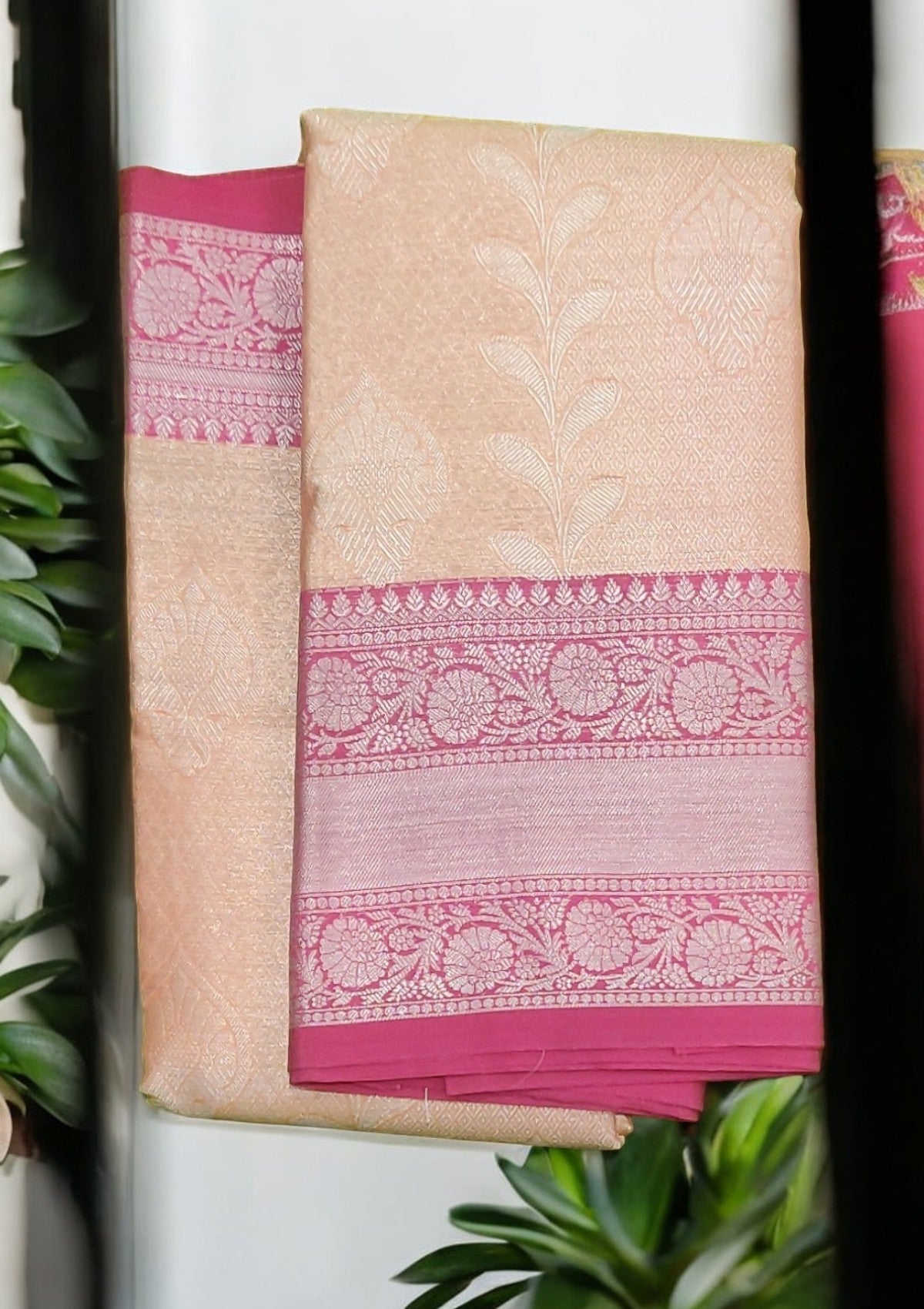 The fabric of Banaras tissue sarees is a delicate blend of silk and zari, giving the saree a translucent, gossamer-like texture. The term "tissue" refers to the lightweight and sheer quality of the fabric.The borders and pallus of these sarees are typically heavily embellished with zari, adding to the overall grandeur. They may also include embroidery, sequins, and beads.