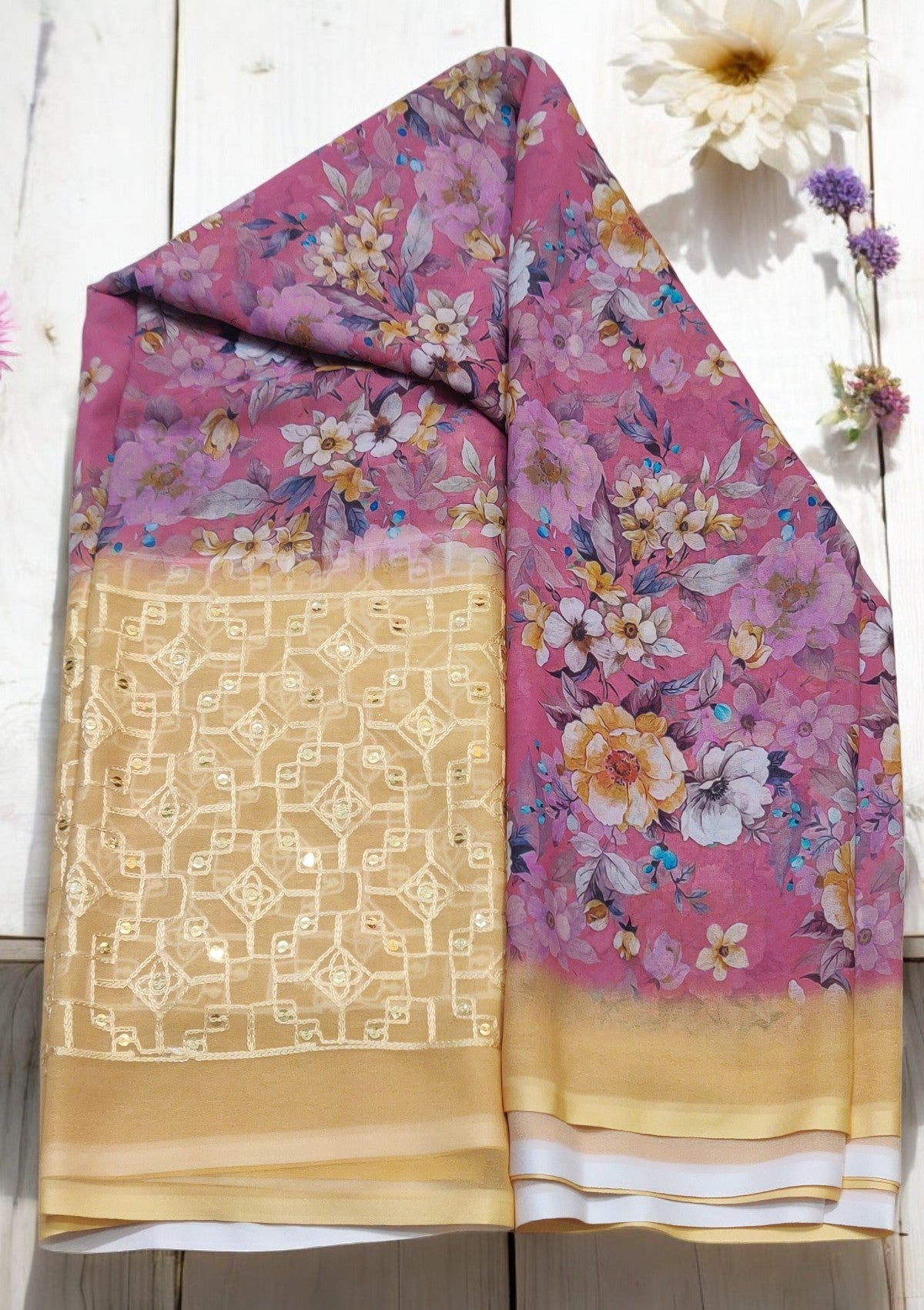 This saree features a modern, elegant design with a soft and feminine color palette. The border of the saree is a deeper peach color with intricate geometric embroidery. The embroidery appears to be done with metallic threads, possibly in gold or silver, giving the saree a subtle shimmer. The border's design adds a touch of sophistication and contrasts nicely with the soft floral print of the body.