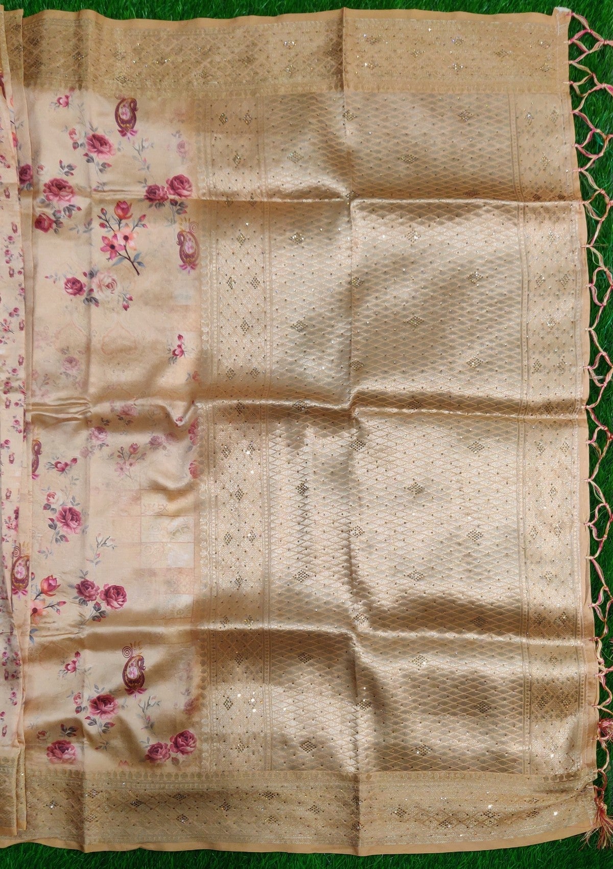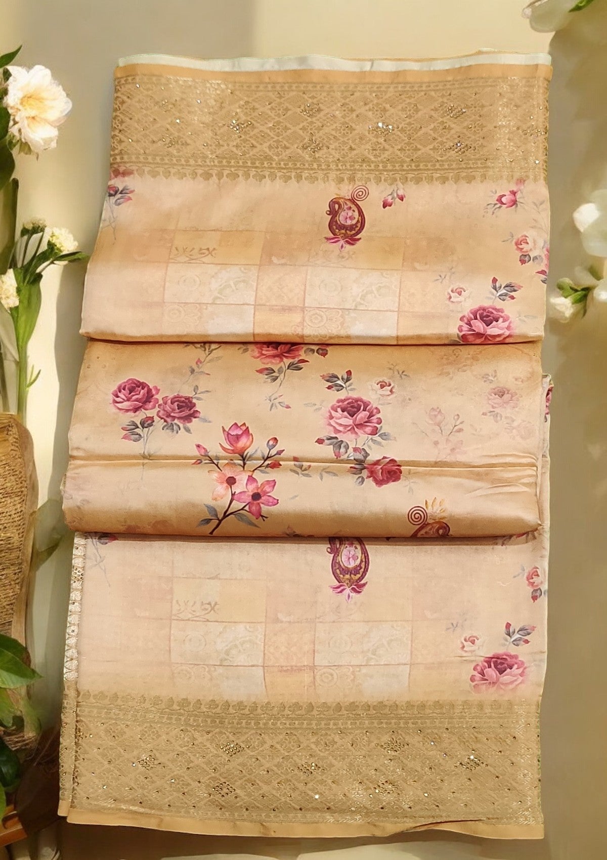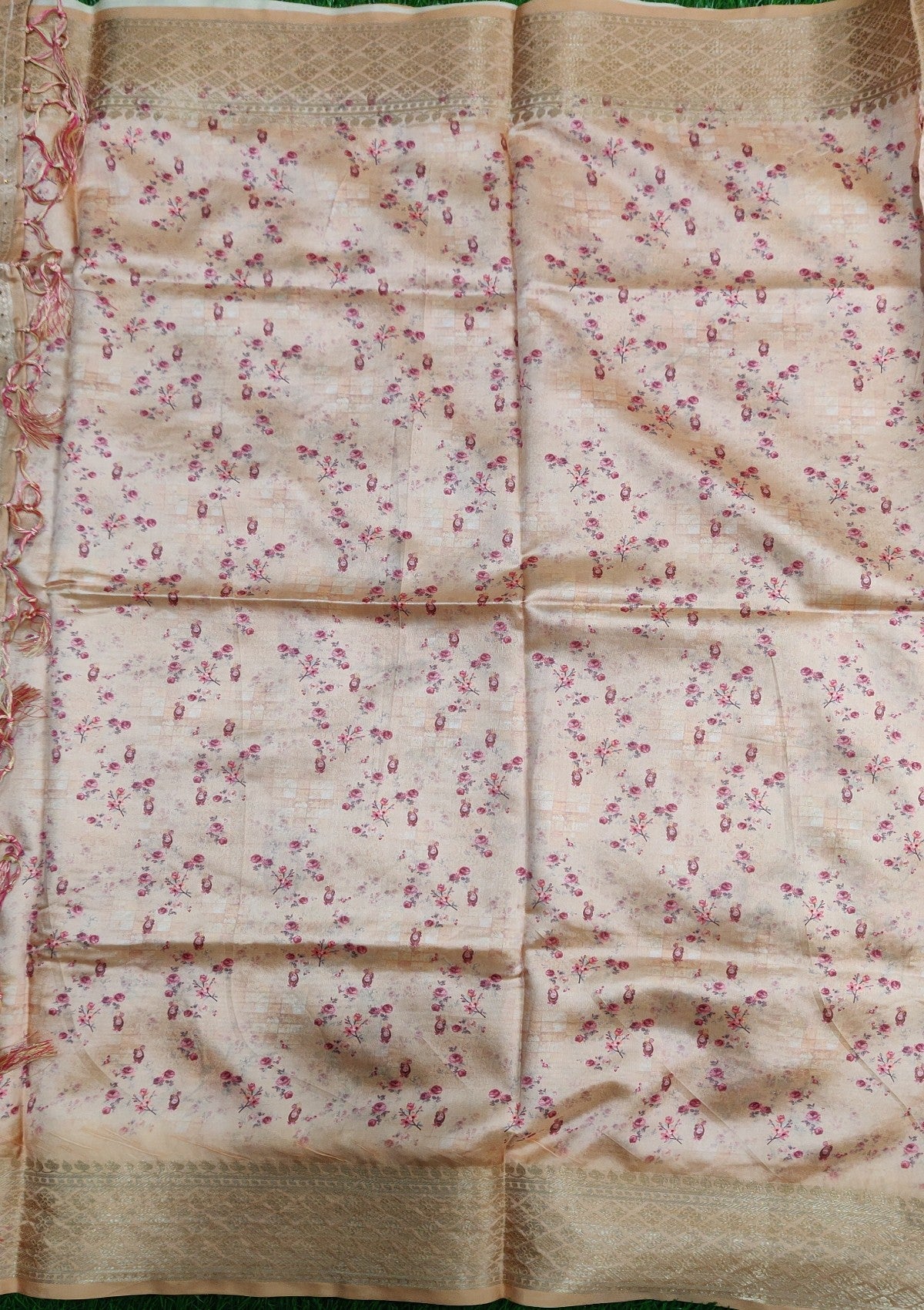 It features a light, pastel base color with a sheen typical of silk. The saree is adorned with floral prints in various colors, including pink, purple, and green, arranged in clusters along the fabric. The border is embellished with intricate golden embroidery, adding a touch of elegance and richness to the saree. The floral design and light color make it suitable for both daytime events and evening occasions.