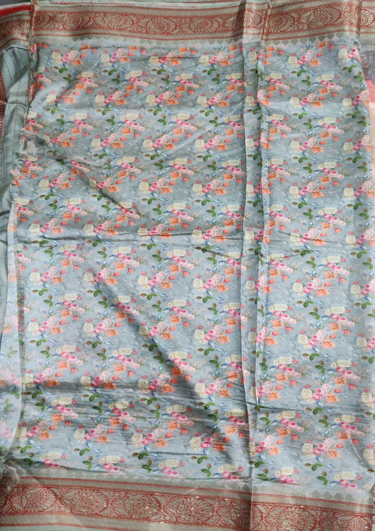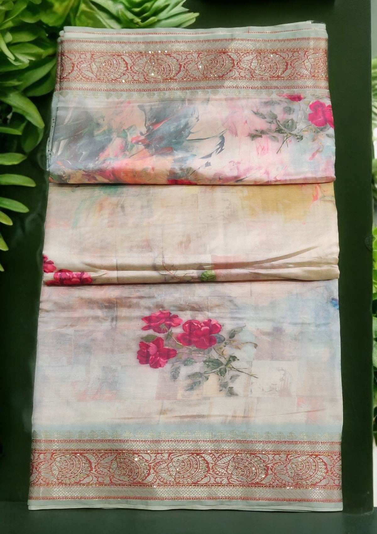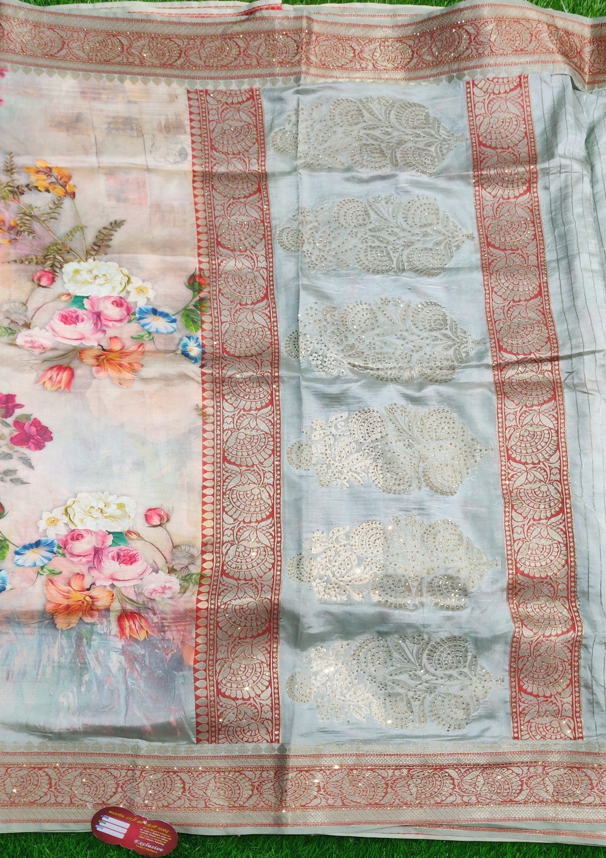 It features a light, pastel base color with a sheen typical of silk. The saree is adorned with floral prints in various colors, including pink, purple, and green, arranged in clusters along the fabric. The border is embellished with intricate golden embroidery, adding a touch of elegance and richness to the saree. The floral design and light color make it suitable for both daytime events and evening occasions.