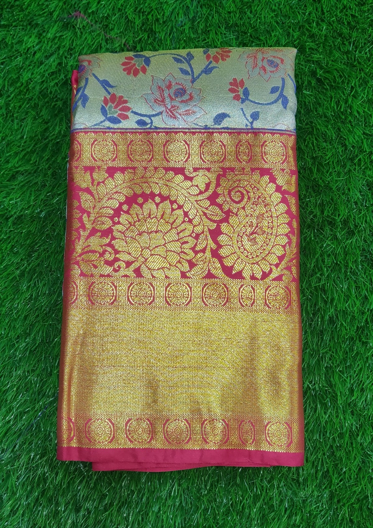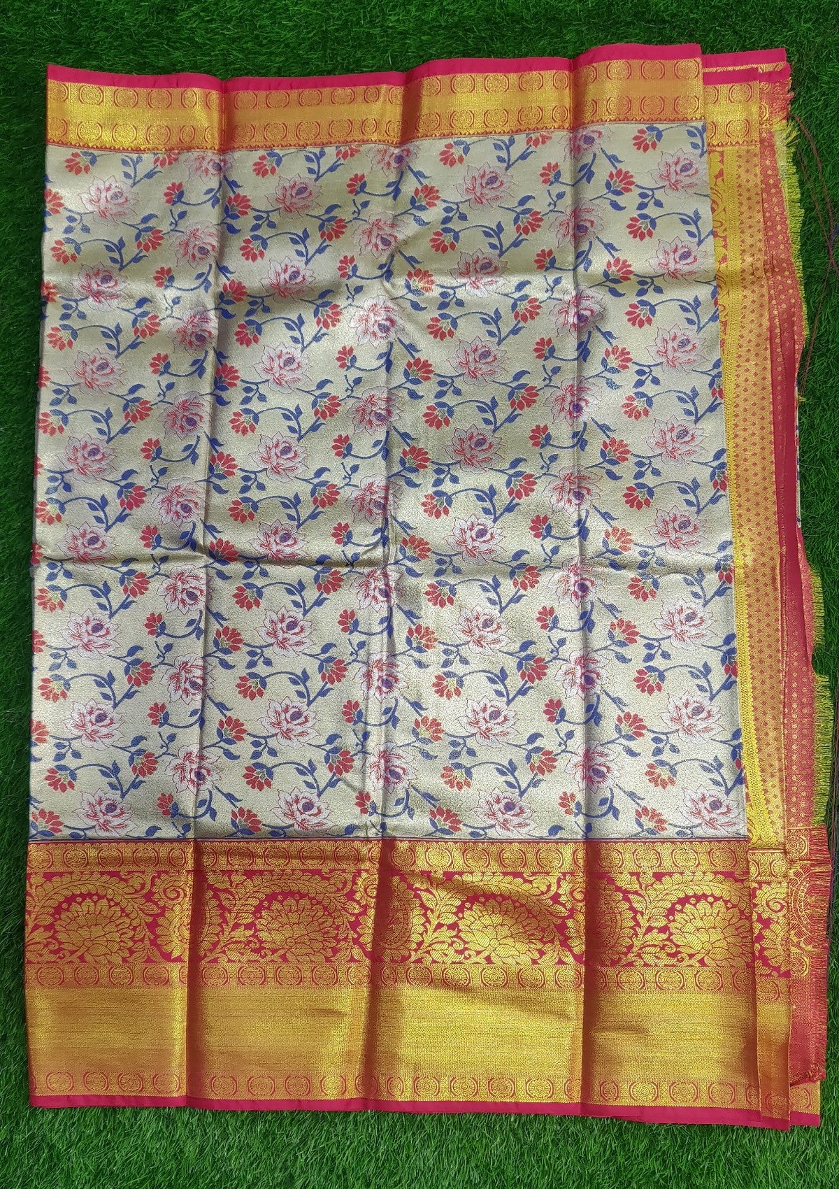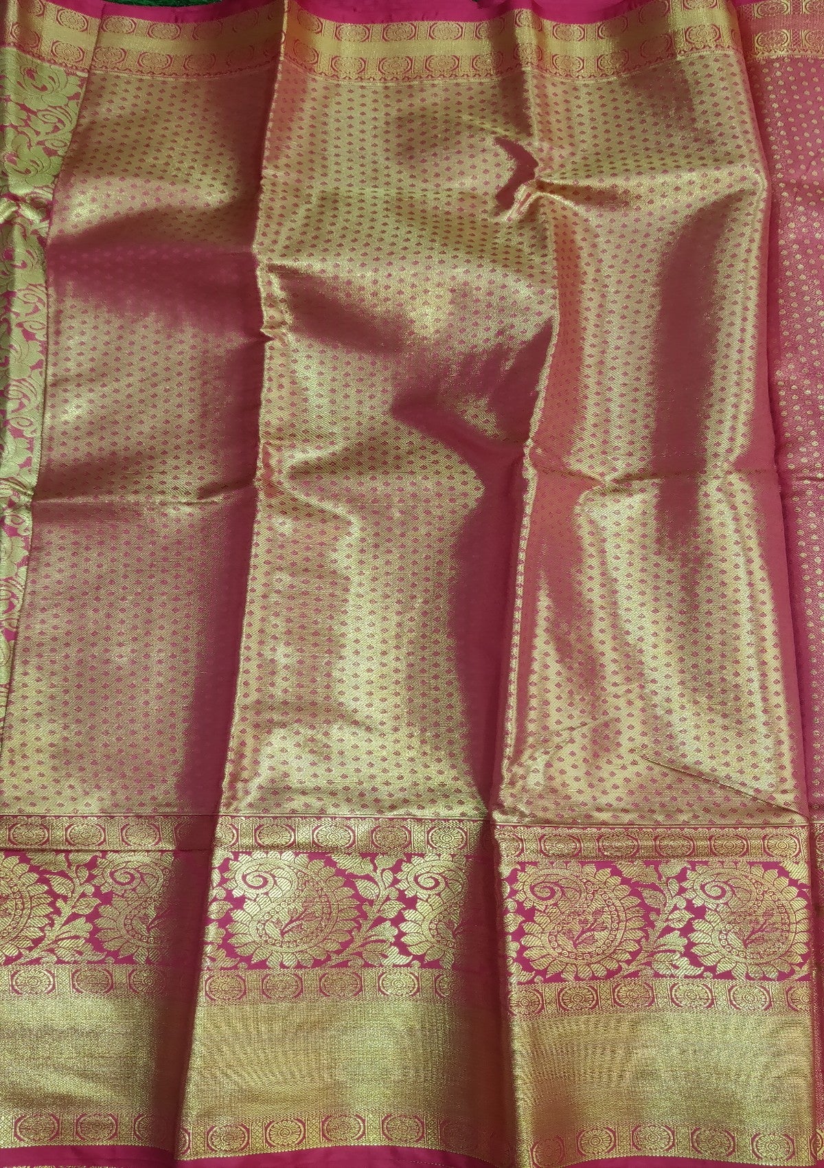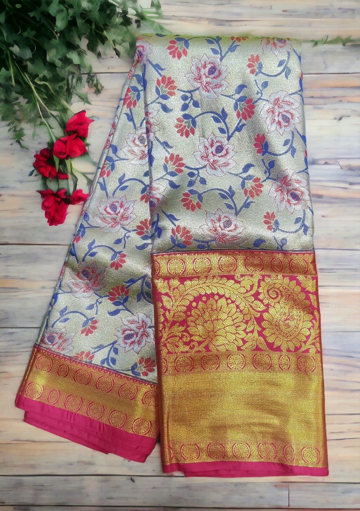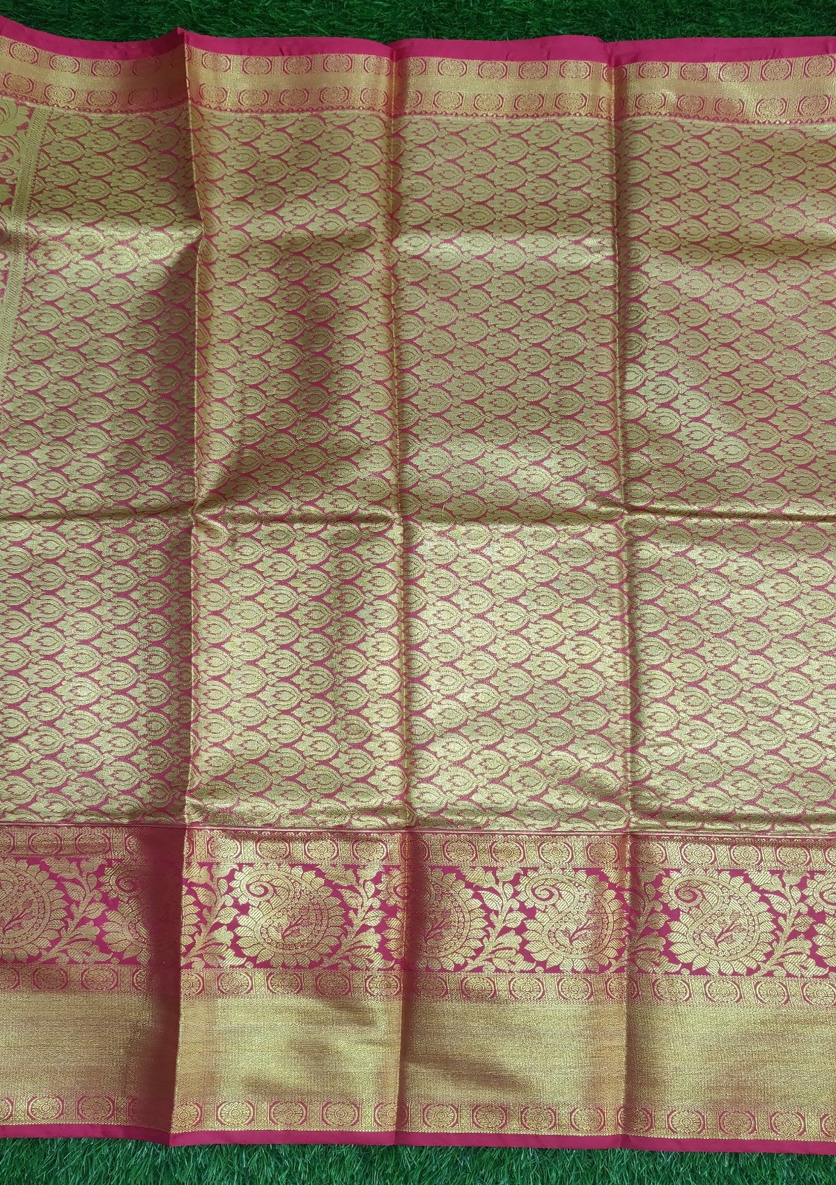 Crafted from luxurious silk fabric, the saree boasts a soft and lustrous texture that drapes gracefully over the body, flattering every silhouette. The intricate jal (net-like) design delicately adorns the entire saree, adding an ethereal touch to its beauty. The kadiyal technique, characterized by hand-woven borders, further enhances its allure, showcasing the artisan's meticulous attention to detail.