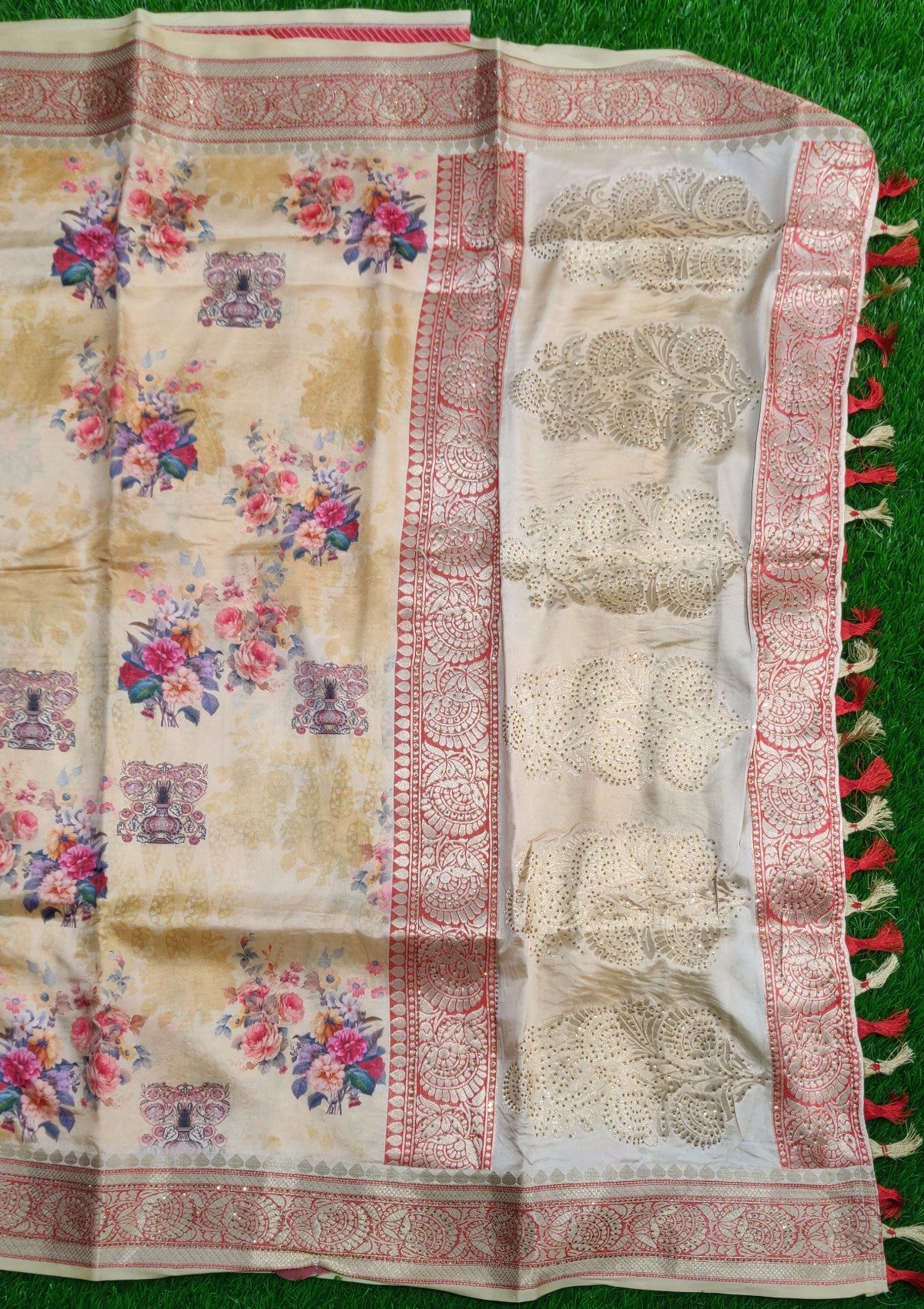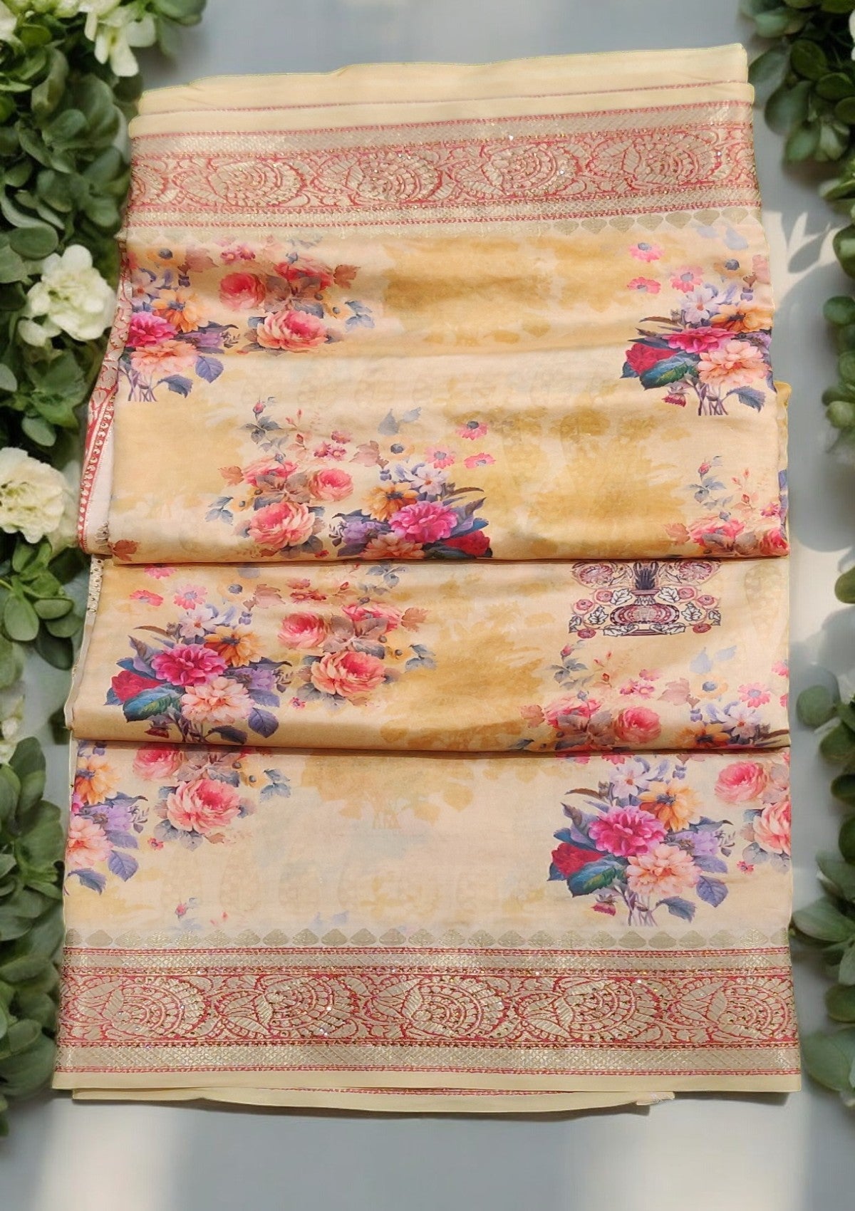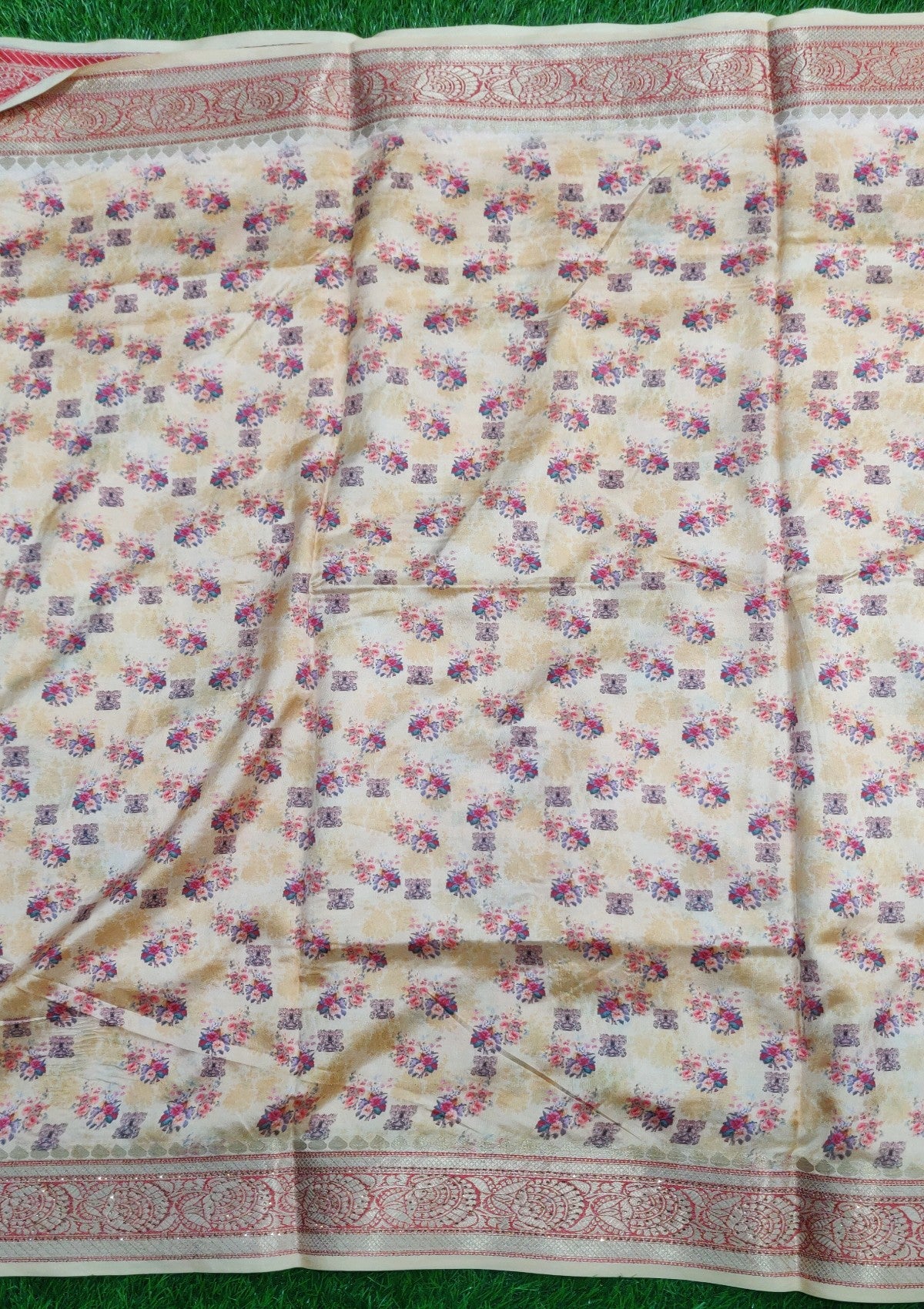 It features a light, pastel base color with a sheen typical of silk. The saree is adorned with floral prints in various colors, including pink, purple, and green, arranged in clusters along the fabric. The border is embellished with intricate golden embroidery, adding a touch of elegance and richness to the saree. The floral design and light color make it suitable for both daytime events and evening occasions.