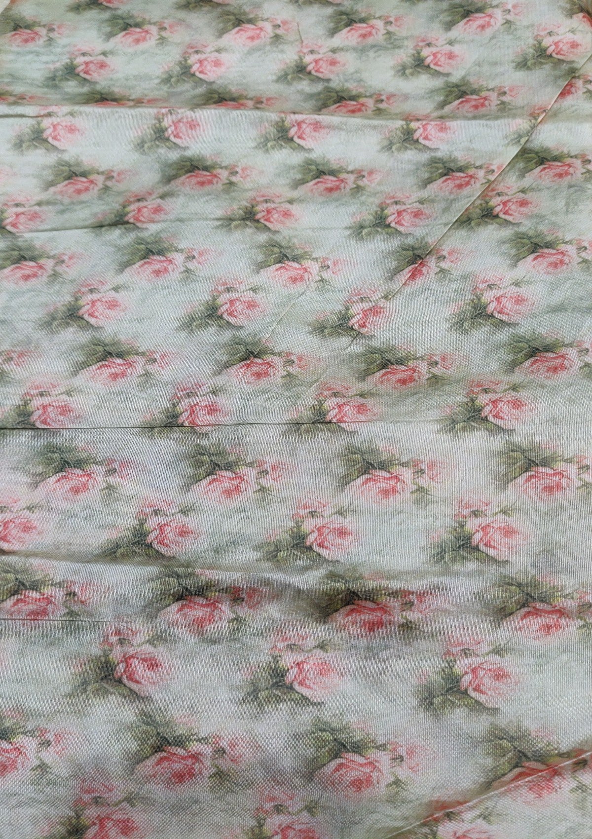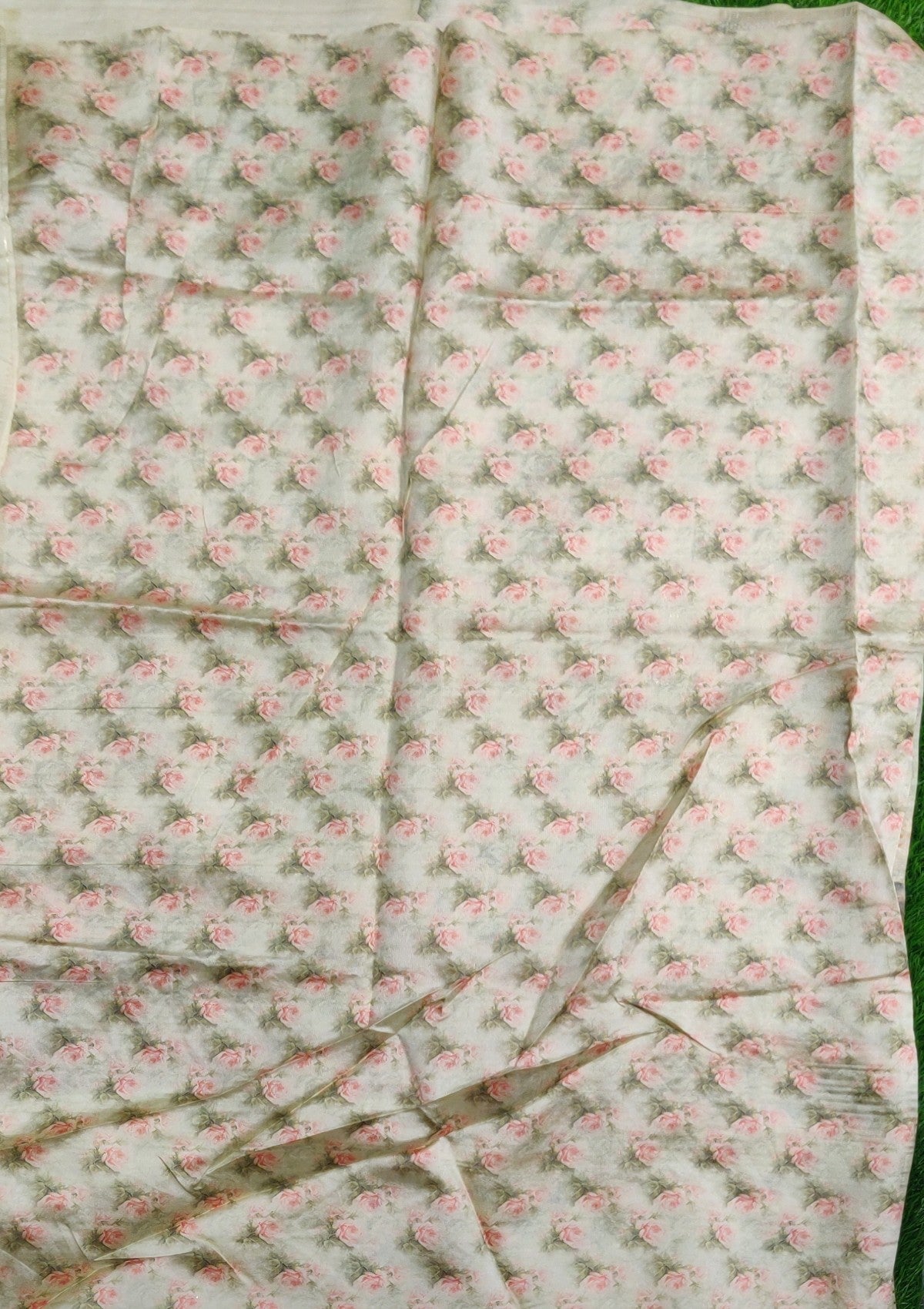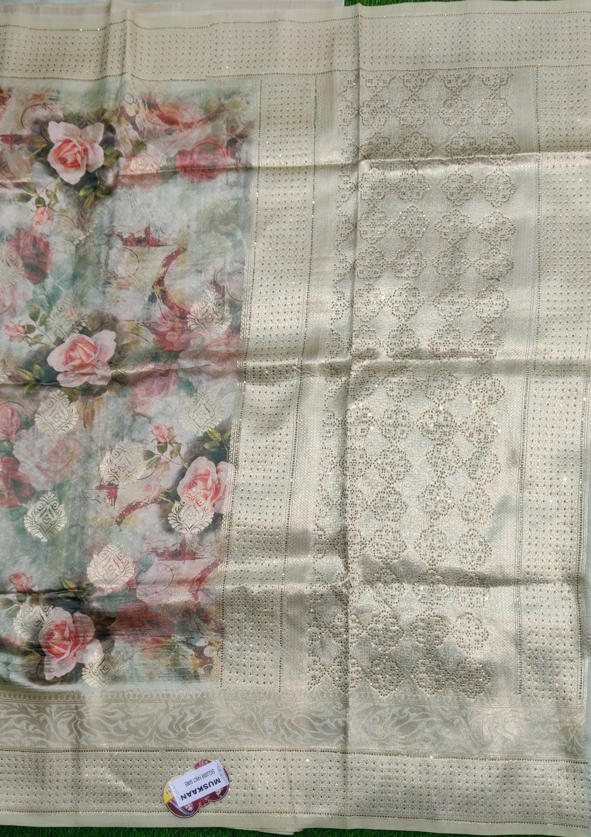 It features a light, pastel base color with a sheen typical of silk. The saree is adorned with floral prints in various colors, including pink, purple, and green, arranged in clusters along the fabric. The border is embellished with intricate golden embroidery, adding a touch of elegance and richness to the saree. The floral design and light color make it suitable for both daytime events and evening occasions.