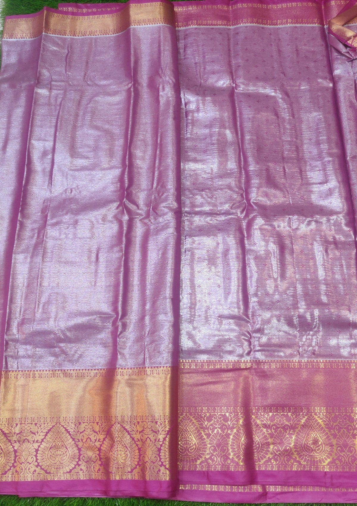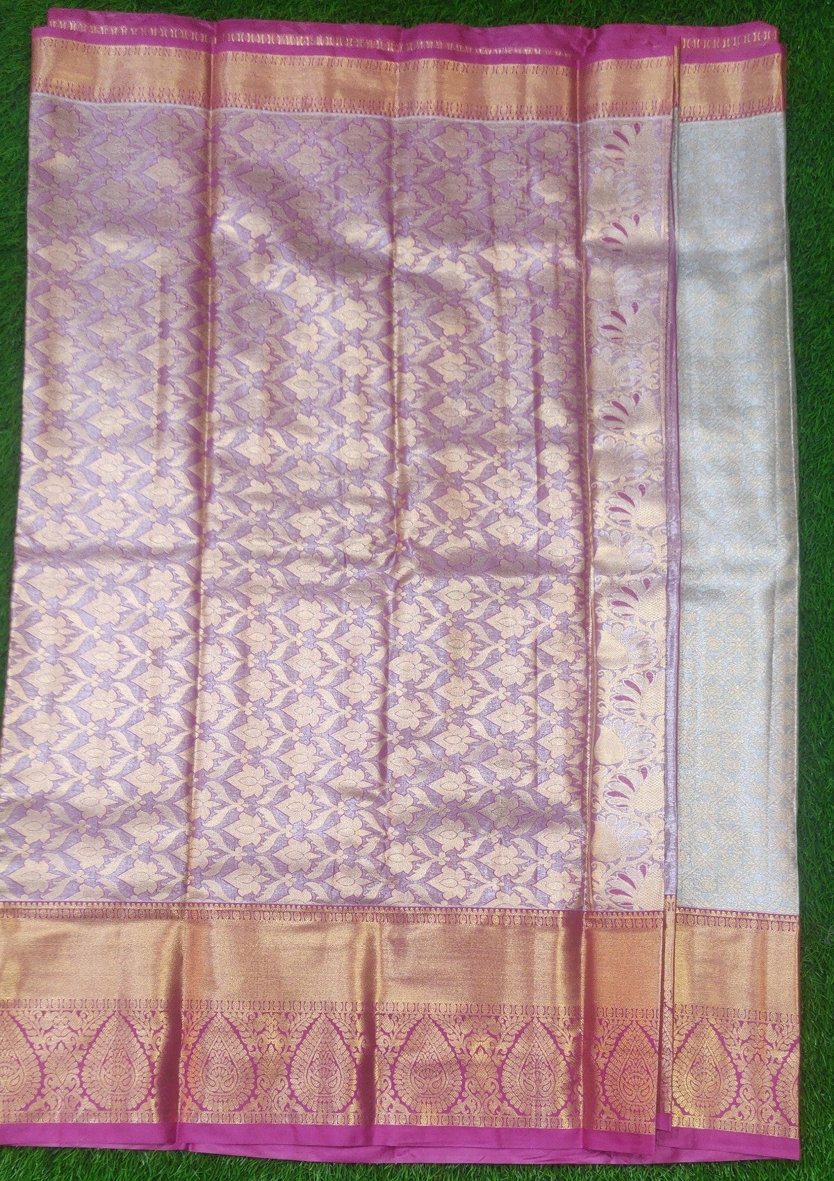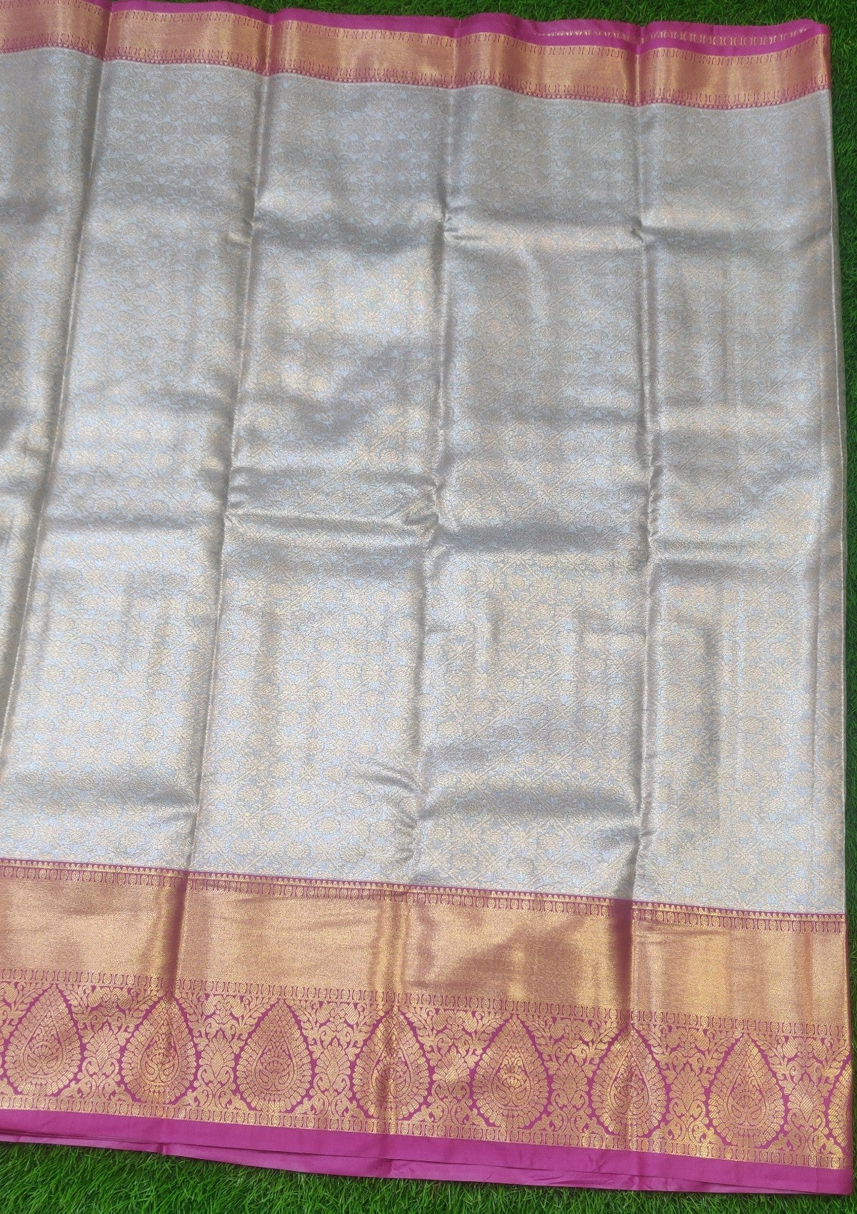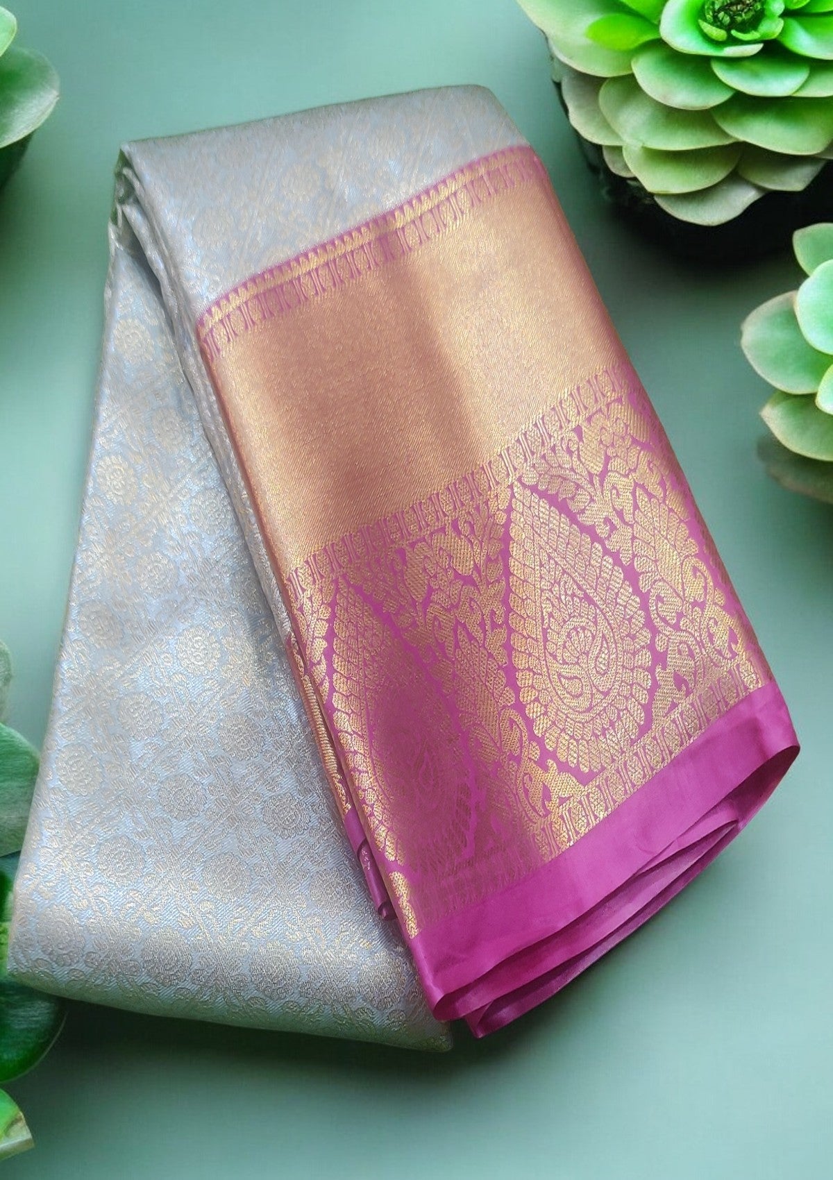 This saree appears to be a traditional silk saree, possibly a Banarasi or Kanjivaram style, known for its rich texture and intricate designs. The body of the saree has a soft with a delicate floral pattern woven throughout. The pallu and border feature a vibrant green color with golden zari work, showcasing intricate floral and geometric patterns, typical of luxurious Indian silk sarees.